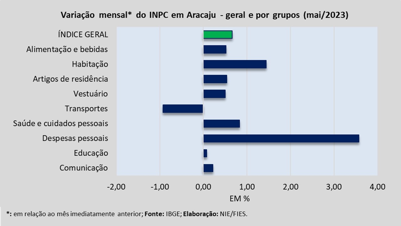 Em Aracaju, no período analisado, dos nove grupos de produtos e serviços pesquisados para medir o comportamento dos preços, apenas um apresentou variação negativa de preço: o grupo de Transporte registrou deflação de (-1,78%).