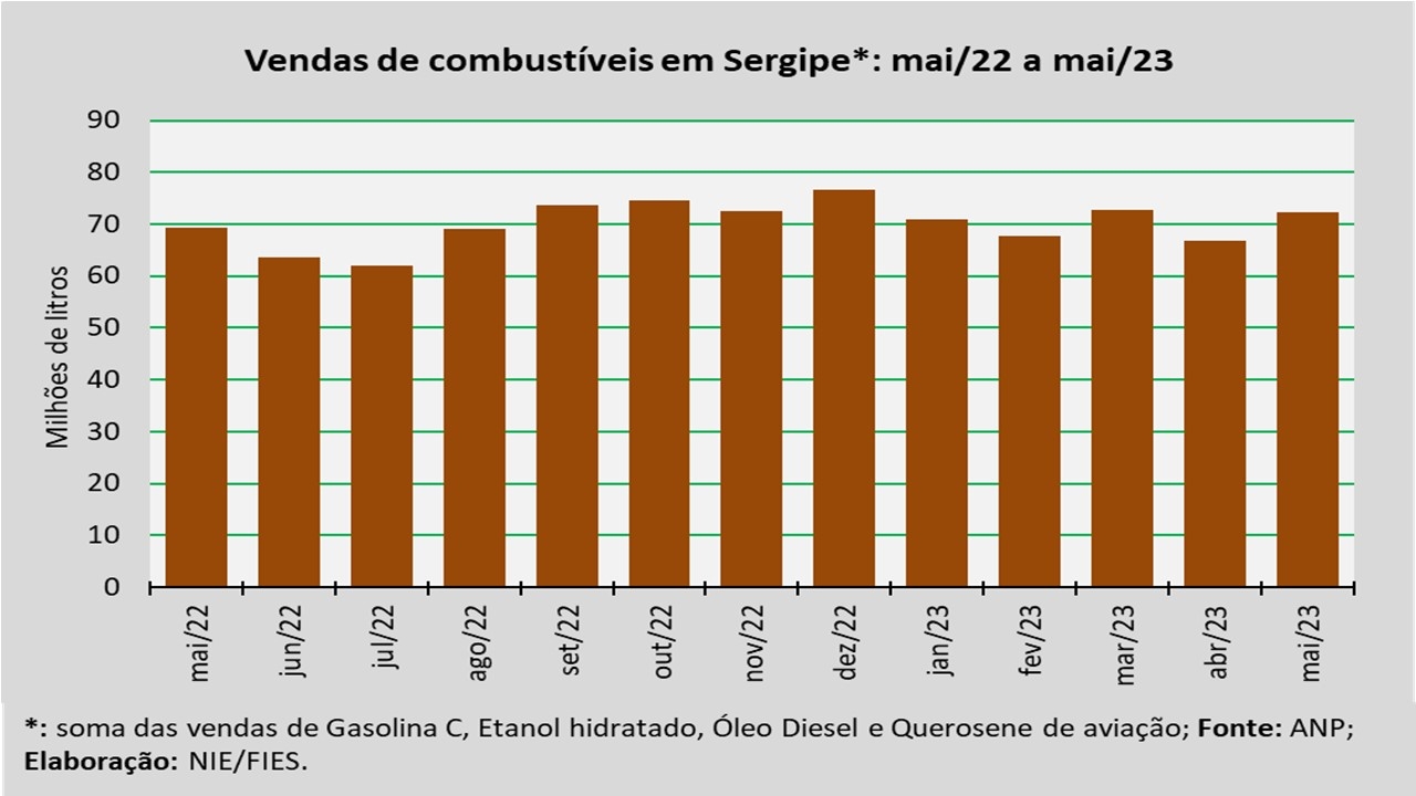 Análise realizada pelo Núcleo de Informações Econômicas da Federação das Indústrias do Estado de Sergipe (FIES), com base nos dados da Agência Nacional do Petróleo, Gás Natural e Biocombustíveis (ANP), indicou que as vendas totais de combustíveis em Sergipe, em maio de 2023, totalizaram aproximadamente 72,4 milhões de litros, assinalando acréscimo de 4,4% quando comparado a maio de 2022. Em relação ao mês imediatamente anterior (abril/2023), as vendas aumentaram 8,2%.