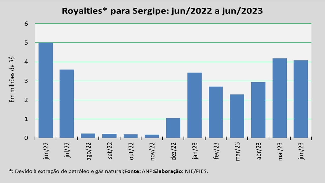 Em junho do ano corrente, os royalties creditados aos municípios sergipanos totalizaram aproximadamente R$ 18,2 milhões. Dentre eles, o município que auferiu a maior fatia foi São Cristóvão, com cerca de R$ 3,9 milhões, ou 21,5% do total.
