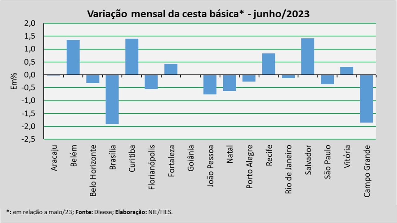 No mês analisado, levando-se em consideração a comparação com o mês anterior (maio/2023), observou-se redução no valor da cesta básica em dez das dezessete capitais pesquisadas, com destaque para: Goiânia (-5,04%), Brasília
