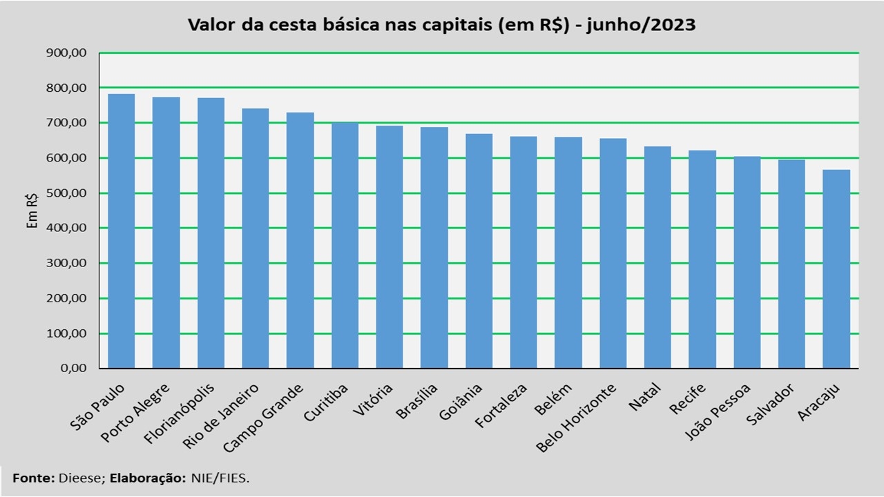 Em termos absolutos, a capital com a cesta mais cara, no mês analisado, foi São Paulo (R$ 783,05), seguida por Porto Alegre (R$ 773,56) e Florianópolis (R$ 771,54). Já as capitais com as cestas mais baratas foram Aracaju (R$ 567,11), seguida de Salvador (R$ 595,84) e João Pessoa (R$ 604,89).