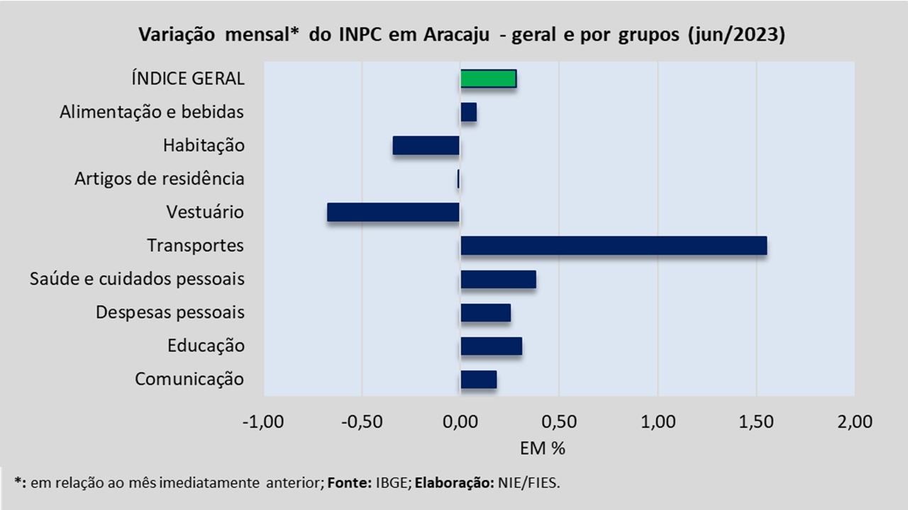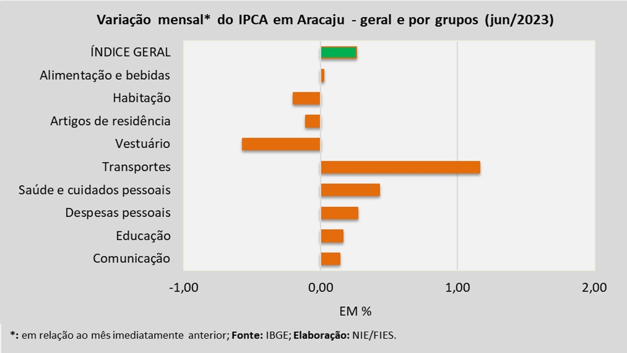 Em Aracaju, no período analisado, dos nove grupos de produtos e serviços pesquisados para medir o comportamento dos preços, três registraram deflação, são eles: o grupo de Vestuários (-0,57%), Habitação (-0,20%) e Artigos de residência (-0,11%).