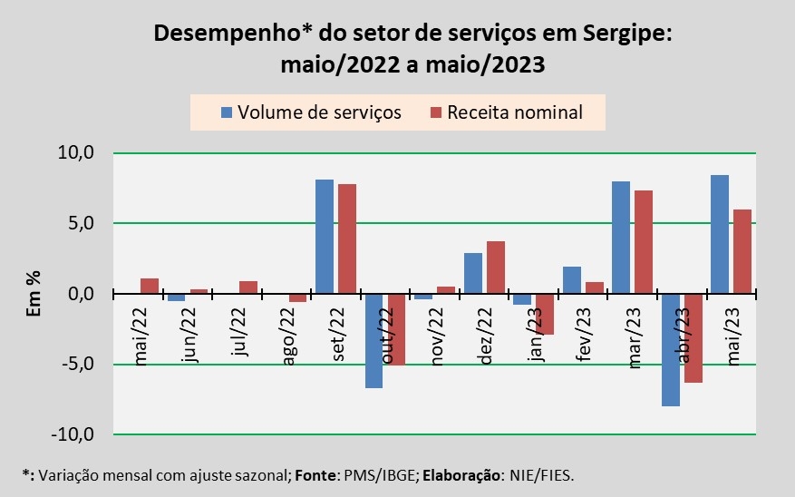 Análise realizada pelo Núcleo de Informações Econômicas da Federação das Indústrias do Estado de Sergipe (FIES), com base nos dados da Pesquisa Mensal de Serviços (PMS) do IBGE, revelou que, em maio, o setor de serviços em Sergipe apresentou aumento de 8,4% no volume de serviços prestados, em relação ao último mês de abril, na série com ajuste sazonal (método utilizado para uniformizar os períodos de comparação). Na comparação com maio de 2022, o volume de serviços assinalou crescimento de 12,3%.