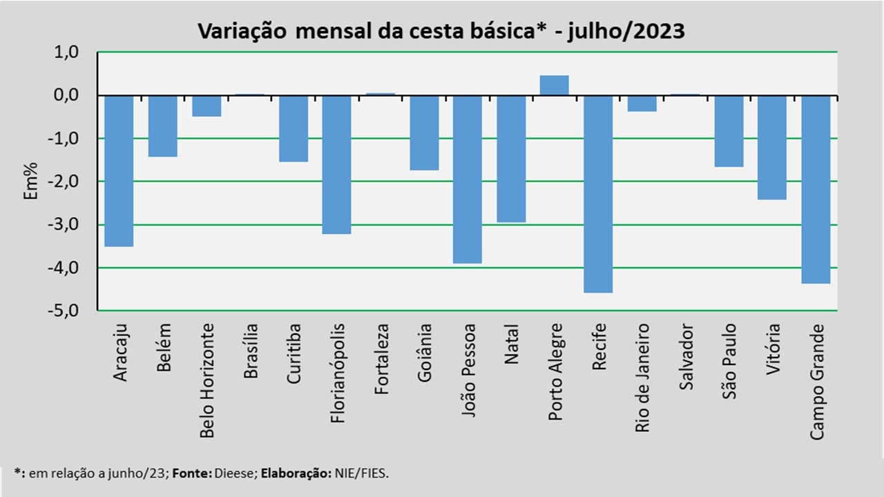 No mês analisado, levando-se em consideração a comparação com o mês anterior (junho/2023), observou-se redução no valor da cesta básica em treze das dezessete capitais pesquisadas, com destaque para: Recife (-4,58%), Campo Grande