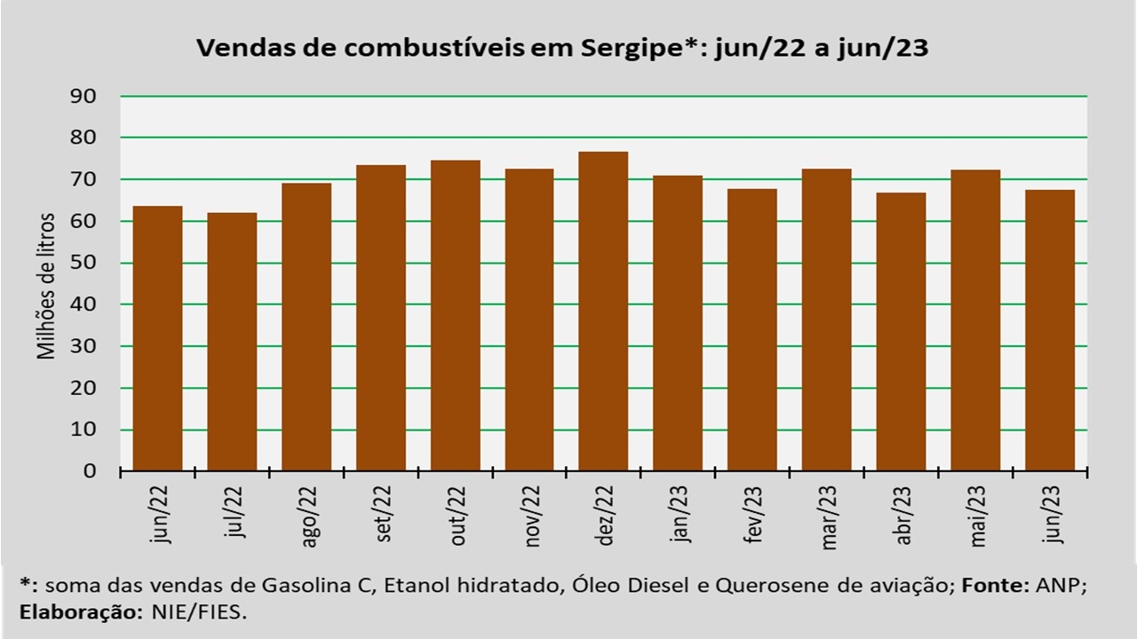 Análise realizada pelo Núcleo de Informações Econômicas da Federação das Indústrias do Estado de Sergipe (FIES), com base nos dados da Agência Nacional do Petróleo, Gás Natural e Biocombustíveis (ANP), indicou que as vendas totais de combustíveis em Sergipe, em junho de 2023, totalizaram aproximadamente 67,6 milhões de litros, assinalando acréscimo de 6,3% quando comparado a junho de 2022. Em relação ao mês imediatamente anterior (maio/2023), as vendas diminuíram 6,6%.