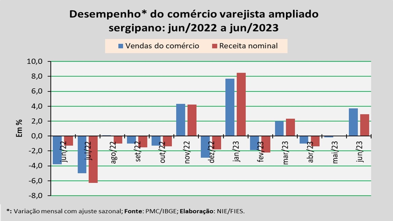 Análise realizada pelo Núcleo de Informações Econômicas da Federação das Indústrias do Estado de Sergipe (FIES), com base nos dados da Pesquisa Mensal do Comércio (PMC) do IBGE, apontou que as vendas do comércio varejista ampliado sergipano, em junho de 2023, assinalaram crescimento de 3,7%, em relação ao mês imediatamente anterior (maio/2023), na série com ajuste sazonal (método que uniformiza os períodos de comparação). No comparativo com junho de 2022, observou-se acréscimo de 8,4%.