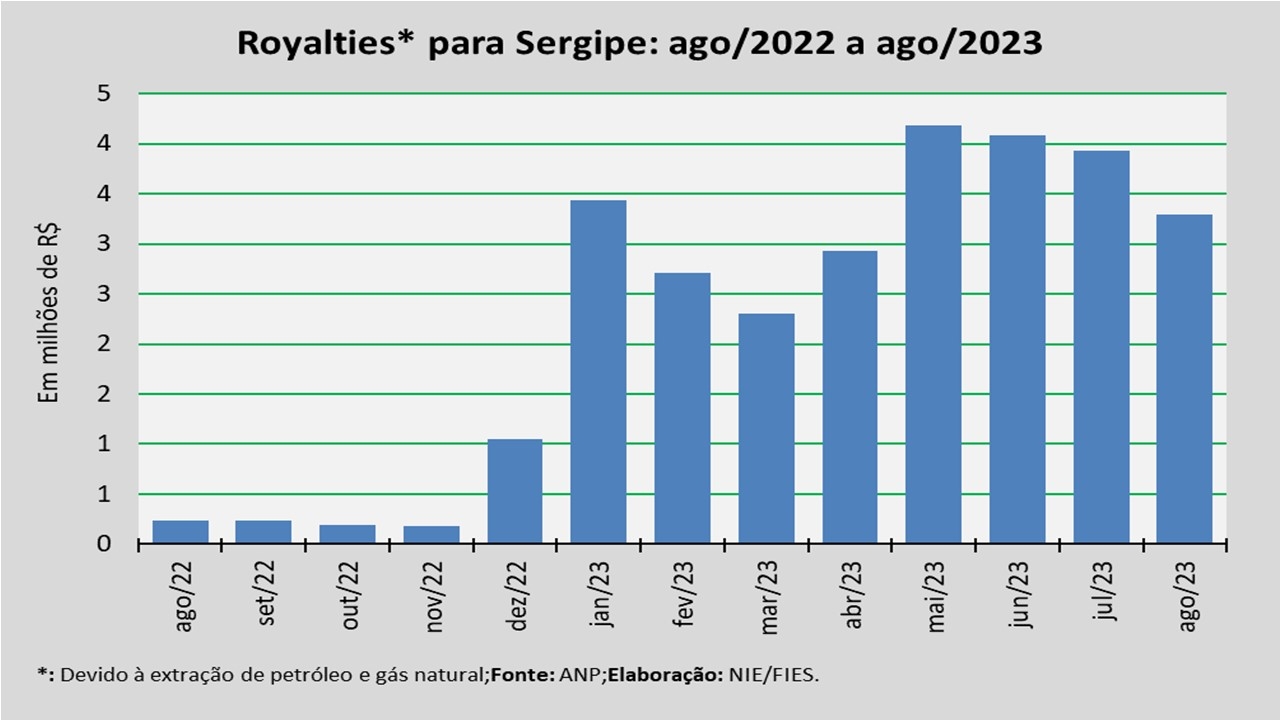 Análise realizada pelo Núcleo de Informações Econômicas da Federação das Indústrias do Estado de Sergipe (FIES), com base nos dados da Agência Nacional do Petróleo, Gás Natural e Biocombustíveis (ANP), revelou que o pagamento de royalties ao Estado de Sergipe, referentes à extração de petróleo e gás natural do mês de junho último, somou cerca de R$ 3,3 milhões. O valor, segundo a ANP, foi creditado em agosto.