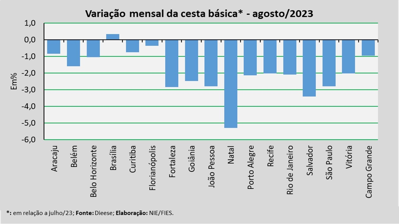 No mês analisado, levando-se em consideração a comparação com o mês anterior (julho/2023), observou-se redução no valor da cesta básica em dezesseis das dezessete capitais pesquisadas, com destaque para: Natal (-5,29%), Salvador (-3,39%) e Fortaleza (-2,85%). Apenas a capital Brasília registrou aumento (+0,35%) no período analisado.