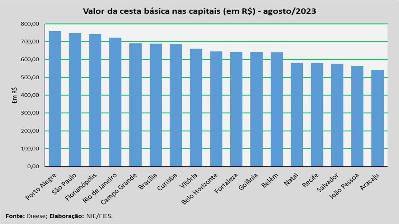 Em termos absolutos, a capital com a cesta mais cara, no mês analisado, foi Porto Alegre (R$ 760,59), seguida por São Paulo (R$ 748,47) e Florianópolis (R$ 743,94). Já as capitais com as cestas mais baratas foram Aracaju (R$ 542,67), seguida de João Pessoa (R$ 565,07) e Salvador (R$ 575,81).