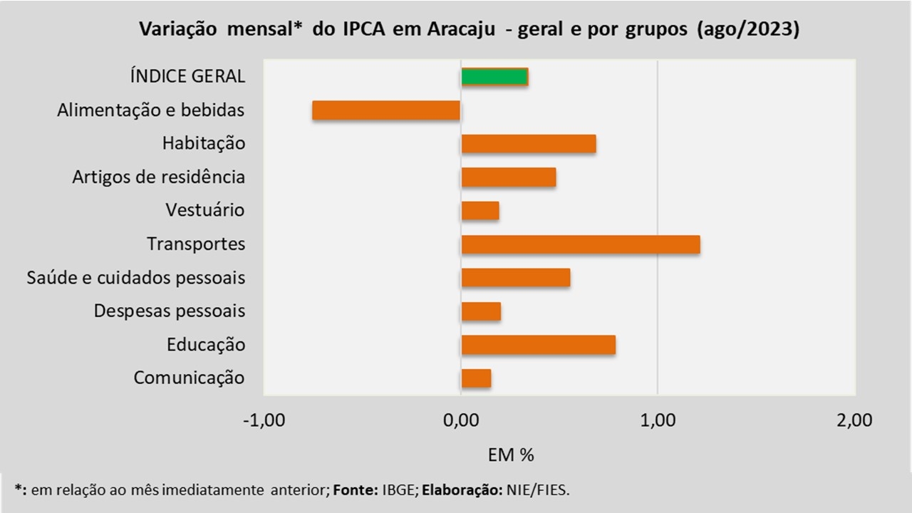 Análise realizada pelo Núcleo de Informações Econômicas da Federação das Indústrias do Estado de Sergipe (FIES), com base nos dados do Instituto Brasileiro de Geografia e Estatística (IBGE), revelou que, em agosto deste ano, a capital sergipana registrou inflação de 0,34%, medida pelo Índice de Preços ao Consumidor Amplo – IPCA.