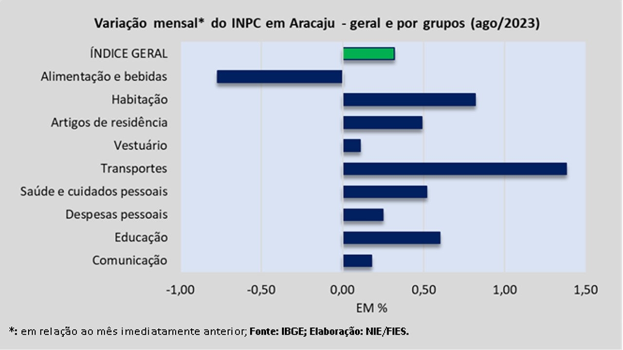 Para esse público, a pesquisa é feita através do Índice Nacional de Preços ao Consumidor (INPC), que registrou inflação de 0,32%, em agosto de 2023, tendo registrado redução de preço em, apenas, um dos noves grupos de produtos e serviços: Alimentação e bebidas (-0,77%).