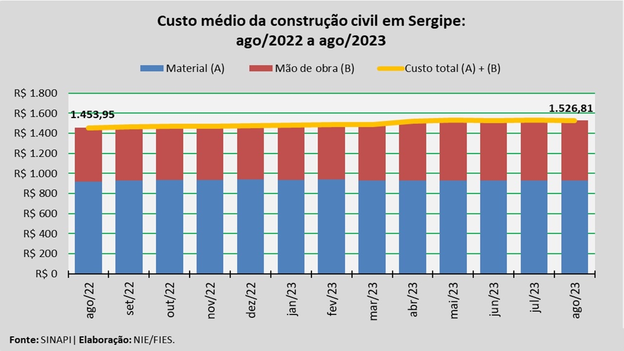 Em termos relativos, o custo com material, no mês considerado, teve aumento de 1,1% na comparação com o mesmo mês do ano que findou (agosto/2022). Quando comparado com julho de 2023, verificou-se decréscimo de 0,3%.
