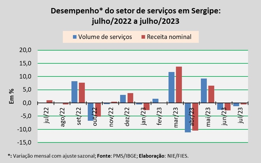 Análise realizada pelo Núcleo de Informações Econômicas da Federação das Indústrias do Estado de Sergipe (FIES), com base nos dados da Pesquisa Mensal de Serviços (PMS) do IBGE, revelou que, em julho, o setor de serviços em Sergipe apresentou redução de 1,2% no volume de serviços prestados, em relação ao último mês de junho, na série com ajuste sazonal (método utilizado para uniformizar os períodos de comparação). Na comparação com julho de 2022, o volume de serviços assinalou crescimento de 8,7%.