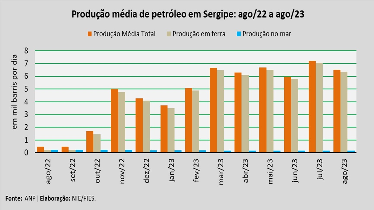 Análise realizada pelo Núcleo de Informações Econômicas da Federação das Indústrias do Estado de Sergipe (FIES), com base nos dados da Agência Nacional do Petróleo, Gás Natural e Biocombustíveis (ANP), revelou que a produção de petróleo no estado, no mês de agosto, alcançou, em média, cerca de 6,5 mil barris por dia (bpd), registrando uma redução de 9,8% em relação à produção média do mês anterior (julho/2023).