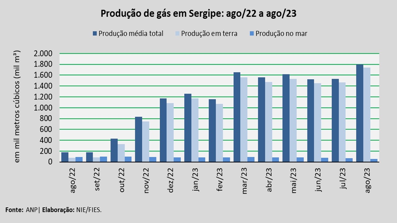 A produção em terra foi a principal fonte de produção de gás natural no estado, totalizando aproximadamente 1,74 milhão de metros cúbicos (m³), no período analisado. Esse volume correspondeu a 97,0% do total produzido no mês de agosto, ao passo que a produção em mar foi de 55 mil metros cúbicos (m³), representando 3,0% da produção.