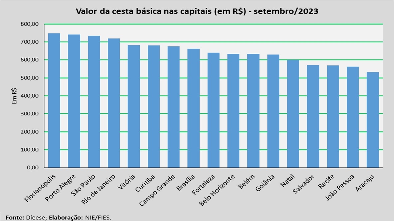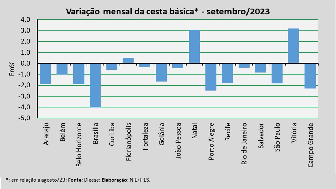 No mês analisado, levando-se em consideração a comparação com o mês anterior (agosto/2023), observou-se redução no valor da cesta básica em quatorze das dezessete capitais pesquisadas, com destaque para: Brasília (-4,03%), Porto Alegre (-2,48%) e Campo Grande (-2,32%). As capitais que registram aumento no período analisado foram: Vitória (+3,18%), Natal (+3,06%) e Florianópolis (+0,50%).