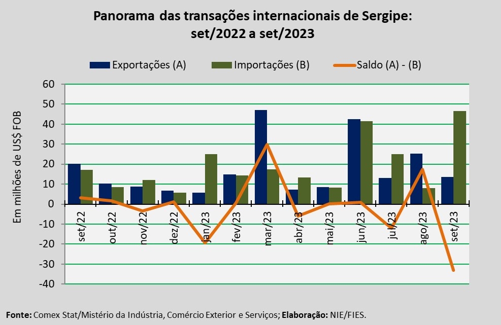Análise realizada pelo Centro Internacional de Negócios – CIN/SE, da Federação das Indústrias do Estado de Sergipe (FIES), com base nos dados do Comex Stat, sistema para consultas e extração de dados do comércio exterior brasileiro, disponibilizado pelo Mistério da Indústria, Comércio Exterior e Serviços, apontou que as exportações sergipanas, em setembro deste ano, somaram aproximadamente US$ 13,5 milhões.