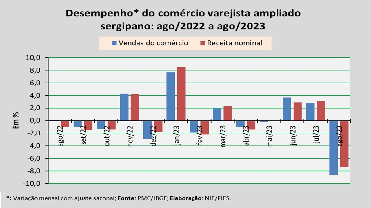 Análise realizada pelo Núcleo de Informações Econômicas da Federação das Indústrias do Estado de Sergipe (FIES), com base nos dados da Pesquisa Mensal do Comércio (PMC) do IBGE, apontou que as vendas do comércio varejista ampliado sergipano, em agosto de 2023, assinalaram retração de 8,6%, em relação ao mês imediatamente anterior (julho/2023), na série com ajuste sazonal (método que uniformiza os períodos de comparação). No comparativo com agosto de 2022, observou-se acréscimo de 1,1%.