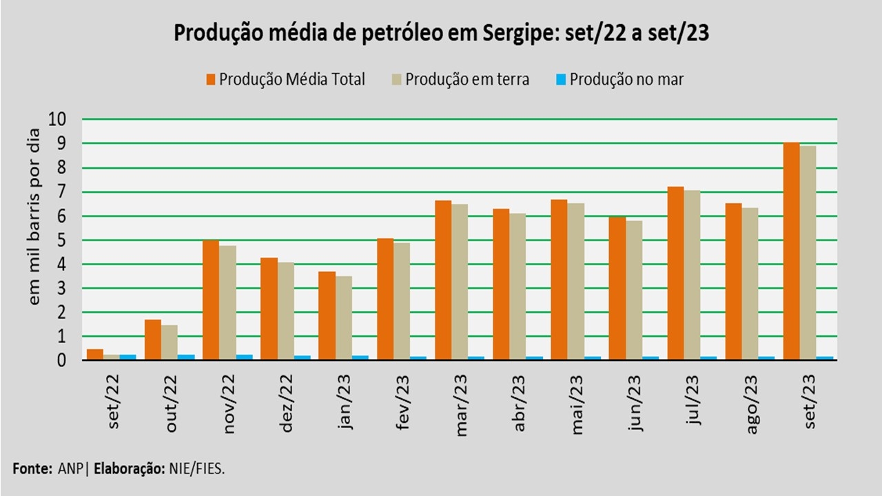 Análise realizada pelo Núcleo de Informações Econômicas da Federação das Indústrias do Estado de Sergipe (FIES), com base nos dados da Agência Nacional do Petróleo, Gás Natural e Biocombustíveis (ANP), revelou que a produção de petróleo no estado, no mês de setembro, alcançou, em média, cerca de 9,1 mil barris por dia (bpd), registrando um aumento de 39,2% em relação à produção média do mês anterior (agosto/2023).