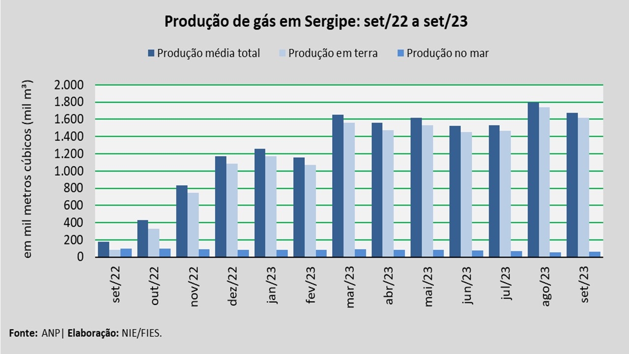 A produção em terra foi a principal fonte de produção de gás natural no estado, totalizando aproximadamente 1,62 milhão de metros cúbicos (m³), no período analisado. Esse volume correspondeu a 96,5% do total produzido no mês de setembro, ao passo que a produção em mar foi de 59 mil metros cúbicos (m³), representando 3,5% da produção.