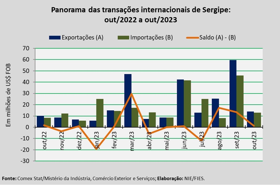 Análise realizada pelo Centro Internacional de Negócios – CIN/SE, da Federação das Indústrias do Estado de Sergipe (FIES), com base nos dados do Comex Stat, sistema para consultas e extração de dados do comércio exterior brasileiro, disponibilizado pelo Mistério da Indústria, Comércio Exterior e Serviços, apontou que as exportações sergipanas, em outubro deste ano, somaram US$ 14,0 milhões.