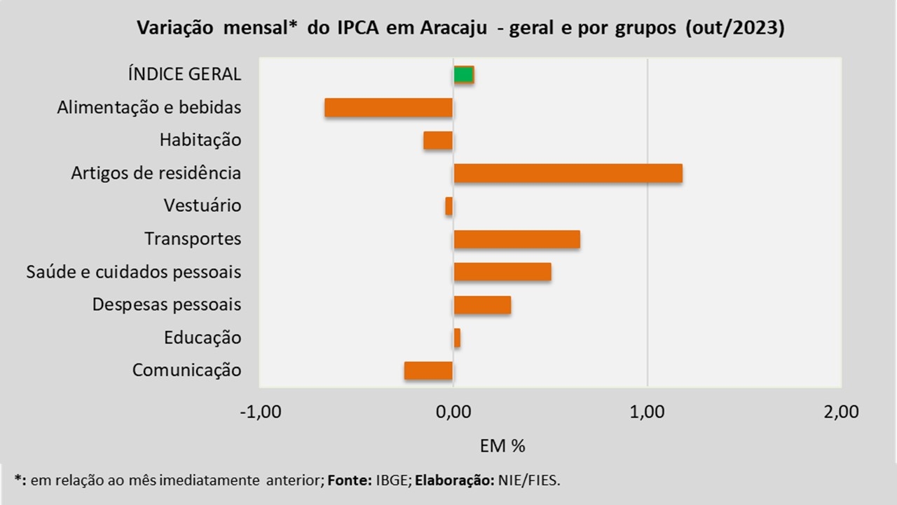 Análise realizada pelo Núcleo de Informações Econômicas da Federação das Indústrias do Estado de Sergipe (FIES), com base nos dados do Instituto Brasileiro de Geografia e Estatística (IBGE), revelou que, em outubro deste ano, a capital sergipana registrou inflação de 0,10%, medida pelo Índice de Preços ao Consumidor Amplo – IPCA.