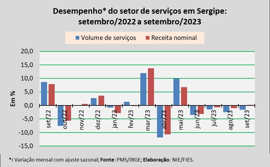 Análise realizada pelo Núcleo de Informações Econômicas da Federação das Indústrias do Estado de Sergipe (FIES), com base nos dados da Pesquisa Mensal de Serviços (PMS) do IBGE, revelou que, em setembro, o setor de serviços em Sergipe apresentou redução de 1,6% no volume de serviços prestados, em relação ao último mês de agosto, na série com ajuste sazonal (método utilizado para uniformizar os períodos de comparação). Na comparação com setembro de 2022, o volume de serviços assinalou queda de 5,6%.