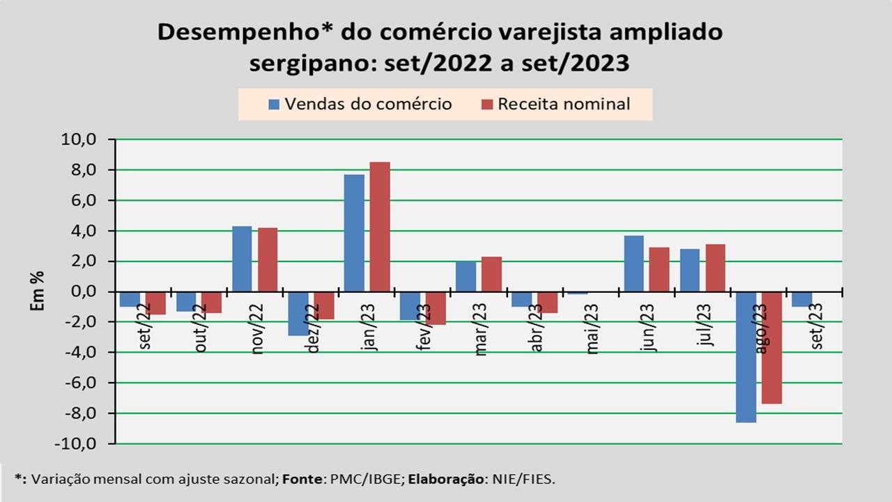 Análise realizada pelo Núcleo de Informações Econômicas da Federação das Indústrias do Estado de Sergipe (FIES), com base nos dados da Pesquisa Mensal do Comércio (PMC) do IBGE, apontou que as vendas do comércio varejista ampliado sergipano, em setembro de 2023, assinalaram retração de 1,0%, em relação ao mês imediatamente anterior (agosto/2023), na série com ajuste sazonal (método que uniformiza os períodos de comparação). No comparativo com setembro de 2022, observou-se acréscimo de 0,7%.