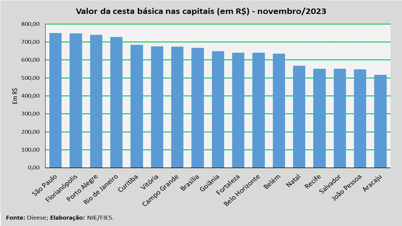 Em termos absolutos, a capital com a cesta mais cara, no mês analisado, foi São Paulo (R$ 749,28), seguida por Florianópolis (R$ 747,59) e Porto Alegre (R$ 739,18). Já as capitais com as cestas mais baratas foram Aracaju (R$ 516,76), seguida de João Pessoa (R$ 548,33) e Salvador (R$ 550,86).