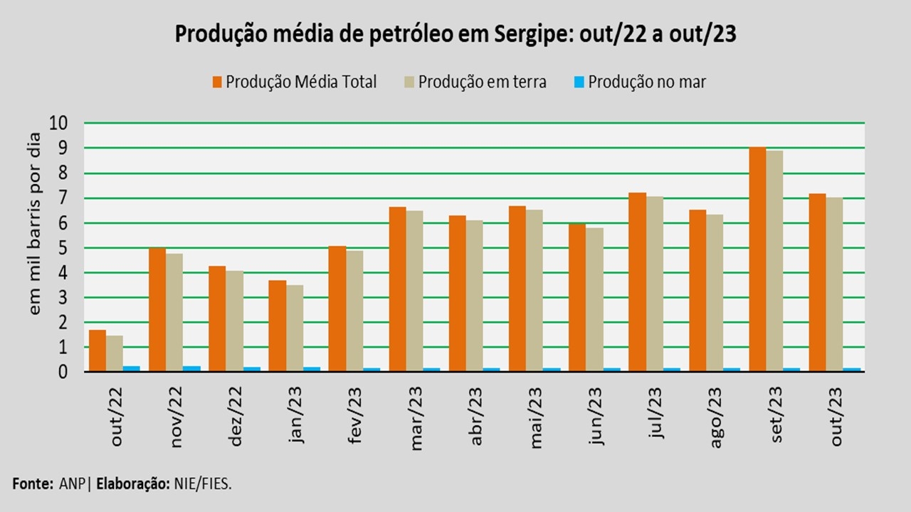 Análise realizada pelo Núcleo de Informações Econômicas da Federação das Indústrias do Estado de Sergipe (FIES), com base nos dados da Agência Nacional do Petróleo, Gás Natural e Biocombustíveis (ANP), revelou que a produção de petróleo no estado, no mês de outubro, alcançou, em média, cerca de 7,2 mil barris por dia (bpd), registrando uma redução de 20,6% em relação à produção média do mês anterior (setembro/2023).
