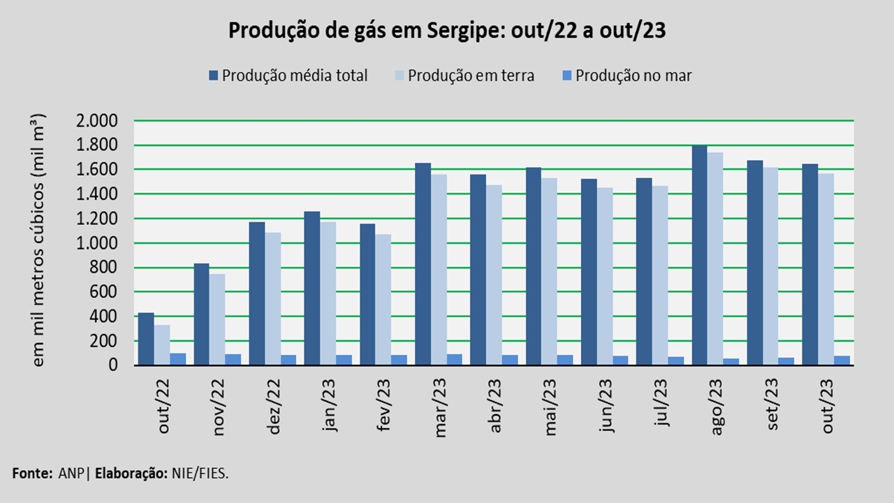 A produção em terra foi a principal fonte de produção de gás natural no estado, totalizando aproximadamente 1,57 milhão de metros cúbicos (m³), no período analisado. Esse volume correspondeu a 95,3% do total produzido no mês de outubro, ao passo que a produção em mar foi de 78 mil metros cúbicos (m³), representando 4,7% da produção.