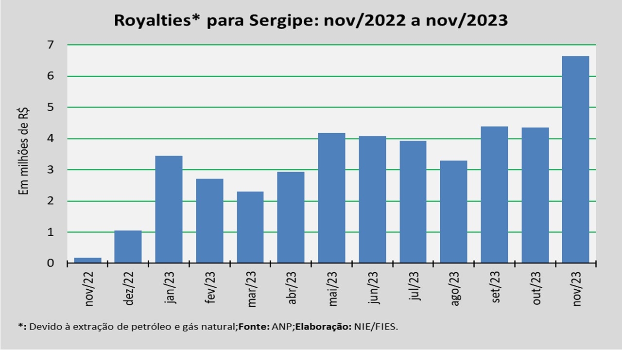 Análise realizada pelo Núcleo de Informações Econômicas da Federação das Indústrias do Estado de Sergipe (FIES), com base nos dados da Agência Nacional do Petróleo, Gás Natural e Biocombustíveis (ANP), revelou que o pagamento de royalties ao Estado de Sergipe, referentes à extração de petróleo e gás natural do mês de setembro último, somou cerca de R$ 6,6 milhões. O valor, segundo a ANP, foi creditado em novembro.