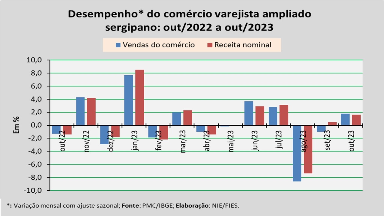 Análise realizada pelo Núcleo de Informações Econômicas da Federação das Indústrias do Estado de Sergipe (FIES), com base nos dados da Pesquisa Mensal do Comércio (PMC) do IBGE, apontou que as vendas do comércio varejista ampliado sergipano, em outubro de 2023, assinalaram crescimento de 1,8%, em relação ao mês imediatamente anterior (setembro/2023), na série com ajuste sazonal (método que uniformiza os períodos de comparação). No comparativo com outubro de 2022, observou-se acréscimo de 8,4%.