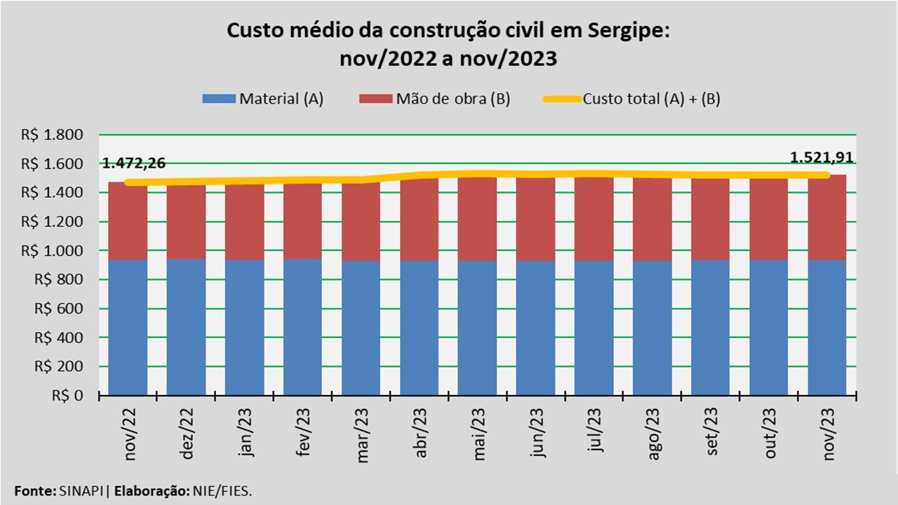 Em termos relativos, o custo com material, no mês considerado, teve redução de 0,2% na comparação com o mesmo mês do ano que findou (novembro/2022). Quando comparado com outubro de 2023, verificou-se acréscimo de 0,1%.