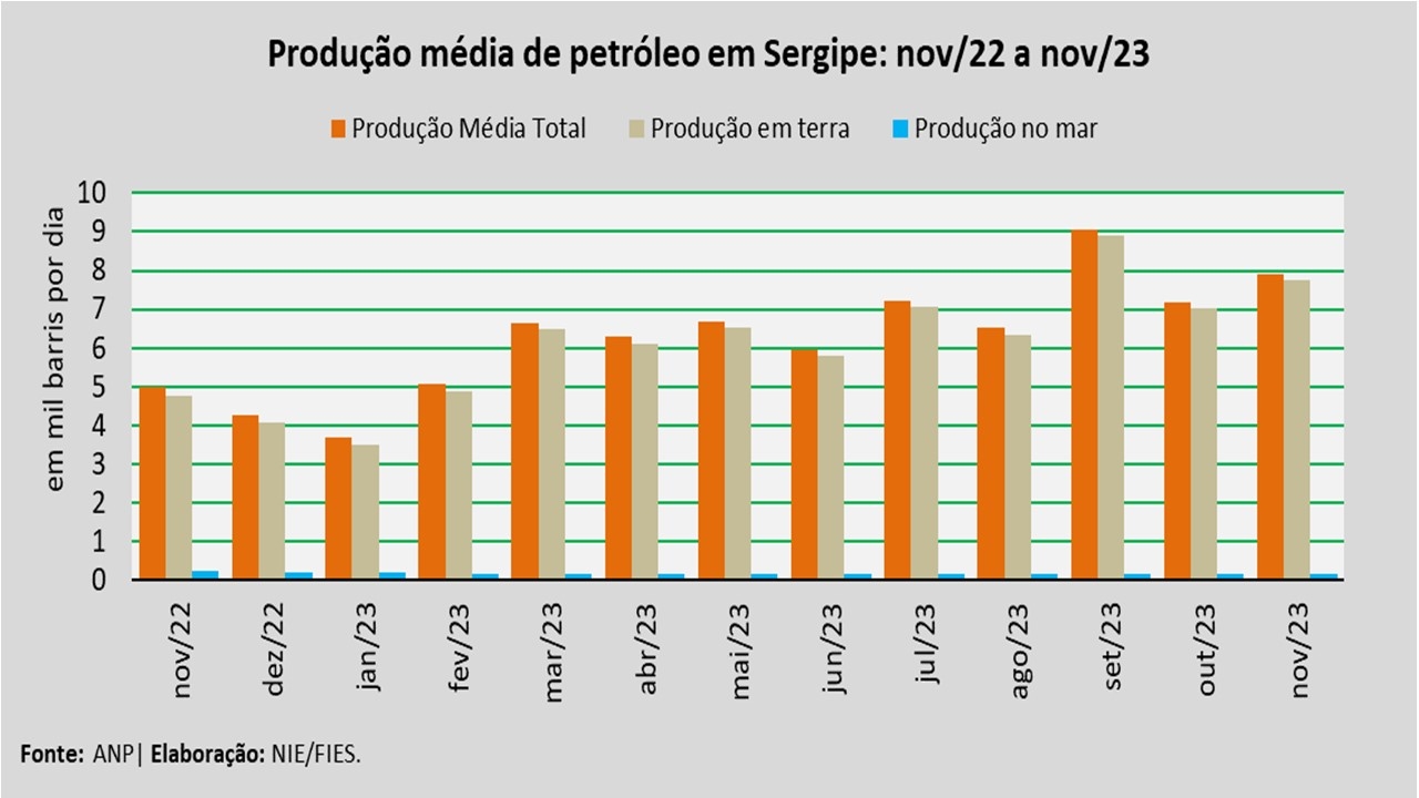 Análise realizada pelo Núcleo de Informações Econômicas da Federação das Indústrias do Estado de Sergipe (FIES), com base nos dados da Agência Nacional do Petróleo, Gás Natural e Biocombustíveis (ANP), revelou que a produção de petróleo no estado, no mês de novembro, alcançou, em média, cerca de 7,9 mil barris por dia (bpd), registrando um aumento de 10,0% em relação à produção média do mês anterior (outubro/2023).