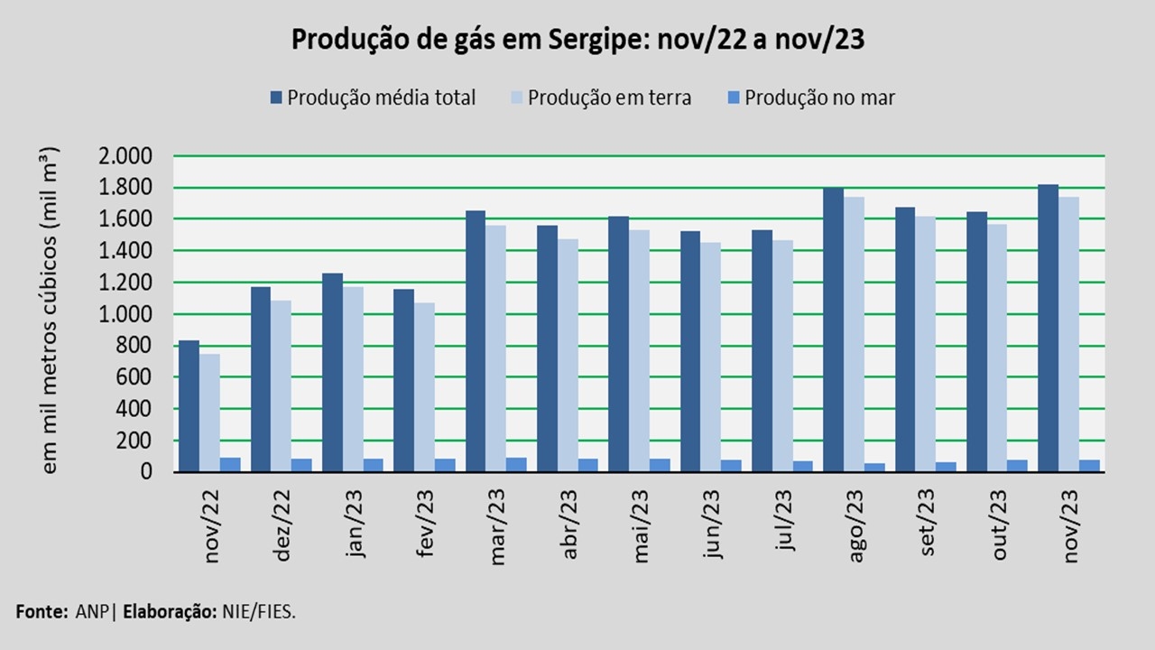 A produção em terra foi a principal fonte de produção de gás natural no estado, totalizando cerca de 1,74 milhão de metros cúbicos (m³), no período analisado. Esse volume correspondeu a 95,7% do total produzido no mês de novembro, ao passo que a produção em mar foi de 79 mil metros cúbicos (m³), representando 4,3% da produção.