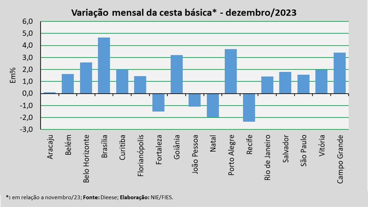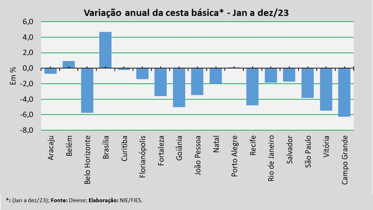 Em 2023 o valor da cesta básica diminuiu em 15 das 17 capitais pesquisadas, em comparação com 2022, destaque para Campo Grande que registrou a redução mais expressiva (-6,25%), seguida de Belo Horizonte (- 5,75%) e Vitória (-5,48%). Por outro lado, Belém (0,94%) e Porto Alegre (0,12%) registram aumento no acumulado de 2023.