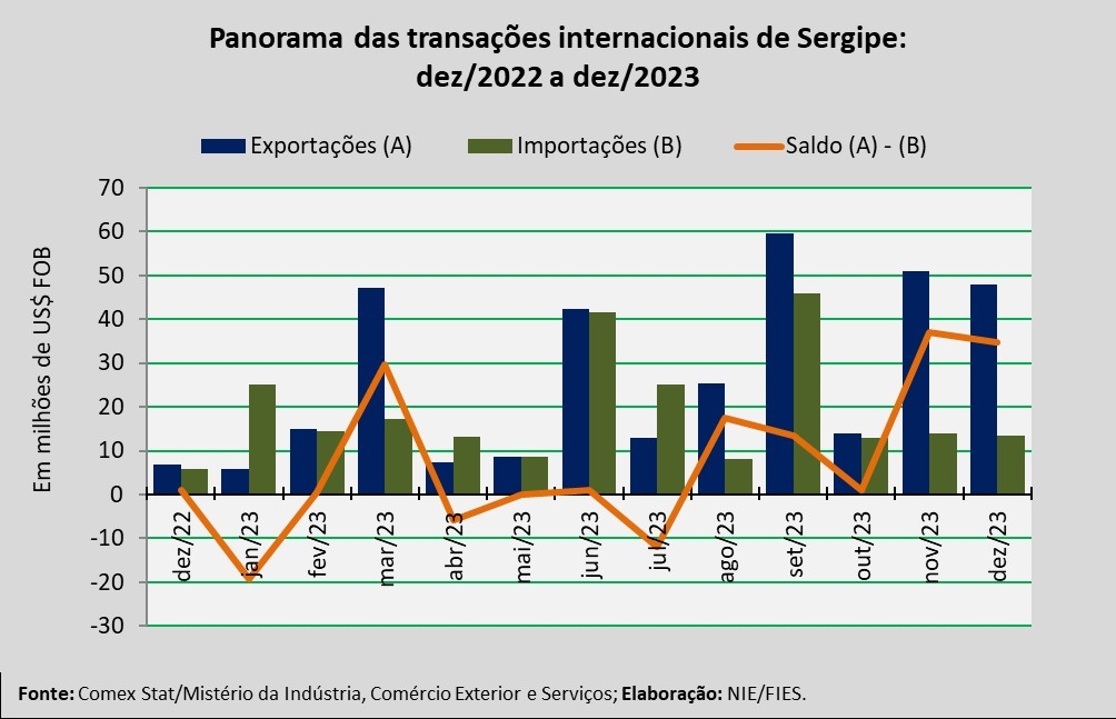 A balança comercial fechou o mês de dezembro com saldo positivo de quase US$ 34,6 mil. Esse saldo resulta da diferença entre o montante de exportações e importações no período. No acumulado do ano de 2023, o saldo da balança comercial em Sergipe registrou superávit de US$ 97,6 milhões, valor 142,1% acima do saldo acumulado em 2022 (déficit de US$ 231,7 milhões).[1]