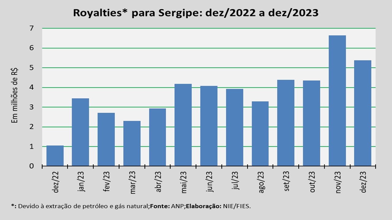 Os royalties creditados ao Estado de Sergipe de janeiro a dezembro de 2023 acumularam R$ 47,6 milhões. O montante acumulado no ano foi 26,7% maior que o acumulado no mesmo período de 2022.