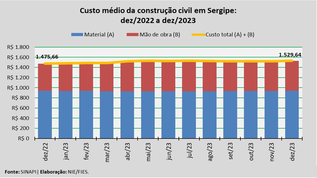 Análise realizada pelo Núcleo de Informações Econômicas da Federação das Indústrias do Estado de Sergipe (FIES), com base nos dados do Sistema Nacional de Pesquisa de Custos e Índices da Construção Civil – SINAPI, uma produção conjunta do IBGE e da Caixa Econômica Federal, revelou que o custo médio da construção em Sergipe, por metro quadrado (m²), em dezembro de 2023, registrou aumento de 0,5%, quando comparado com o mês imediatamente anterior, novembro último. No acumulado do ano que findou, o custo registrado apresentou aumento de 3,7%.