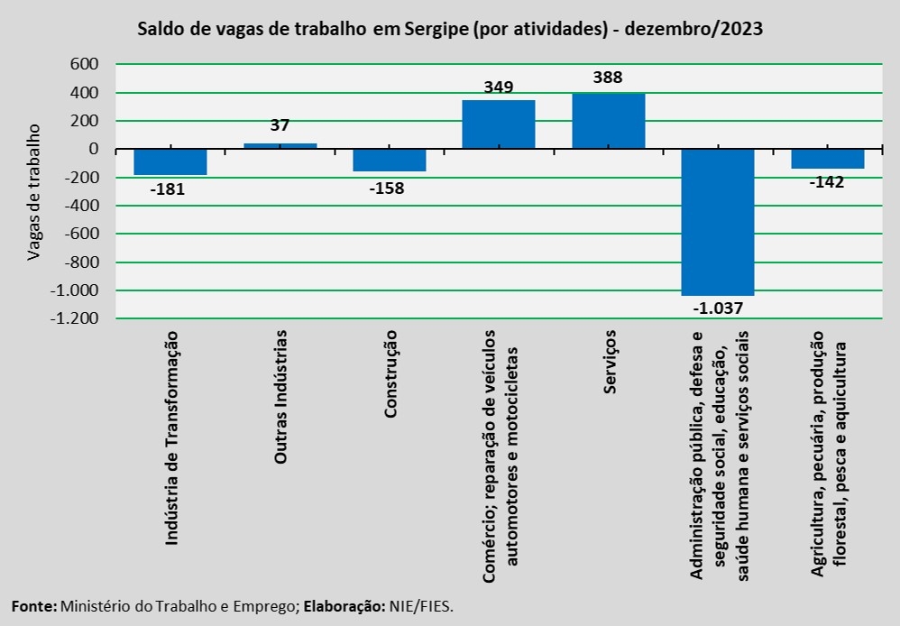 Análise realizada pelo Núcleo de Informações Econômicas da Federação das Indústrias do Estado de Sergipe (FIES), com base nos dados do Novo Cadastro Geral de empregados e desempregados (Caged) do Ministério do Trabalho e Emprego, revelou que houve saldo negativo de 744 vagas de emprego com carteira assinada no estado, em dezembro de 2023. O saldo decorre da diferença entre 7.753 admissões e 8.497 desligamentos, no período analisado.