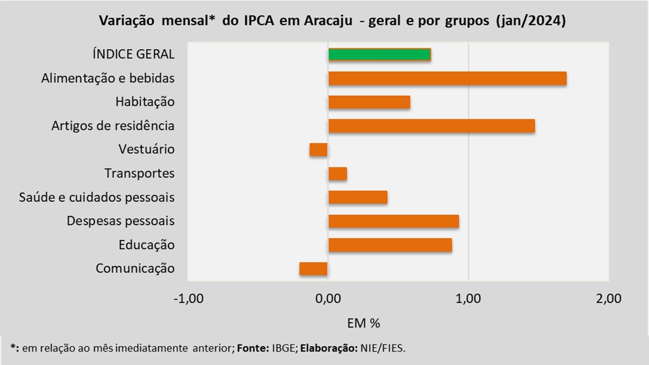 Análise realizada pelo Núcleo de Informações Econômicas da Federação das Indústrias do Estado de Sergipe (FIES), com base nos dados do Instituto Brasileiro de Geografia e Estatística (IBGE), revelou que, em janeiro deste ano, a capital sergipana teve inflação de 0,73%, medida pelo Índice de Preços ao Consumidor Amplo – IPCA.