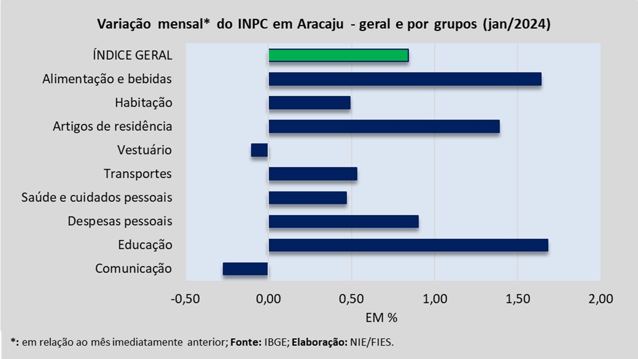 Para esse público, a pesquisa é feita através do Índice Nacional de Preços ao Consumidor (INPC), que registrou inflação de 0,84%, em janeiro de 2024, verificou-se redução de preço em dois dos nove grupos de produtos e serviços analisados, são eles: Comunicação (-0,27%) e Vestuário (-0,10%). O intervalo de comparação é o mesmo do IPCA descrito acima.