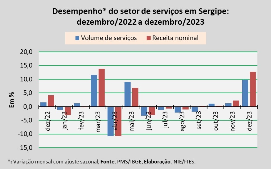 Análise realizada pelo Núcleo de Informações Econômicas da Federação das Indústrias do Estado de Sergipe (FIES), com base nos dados da Pesquisa Mensal de Serviços (PMS) do IBGE, revelou que, em dezembro de 2023, o setor de serviços em Sergipe apresentou aumento de 9,8% no volume de serviços prestados, em relação ao último mês de novembro, na série com ajuste sazonal (método utilizado para uniformizar os períodos de comparação). Na comparação com dezembro de 2022, o volume de serviços assinalou crescimento de 12,1%.