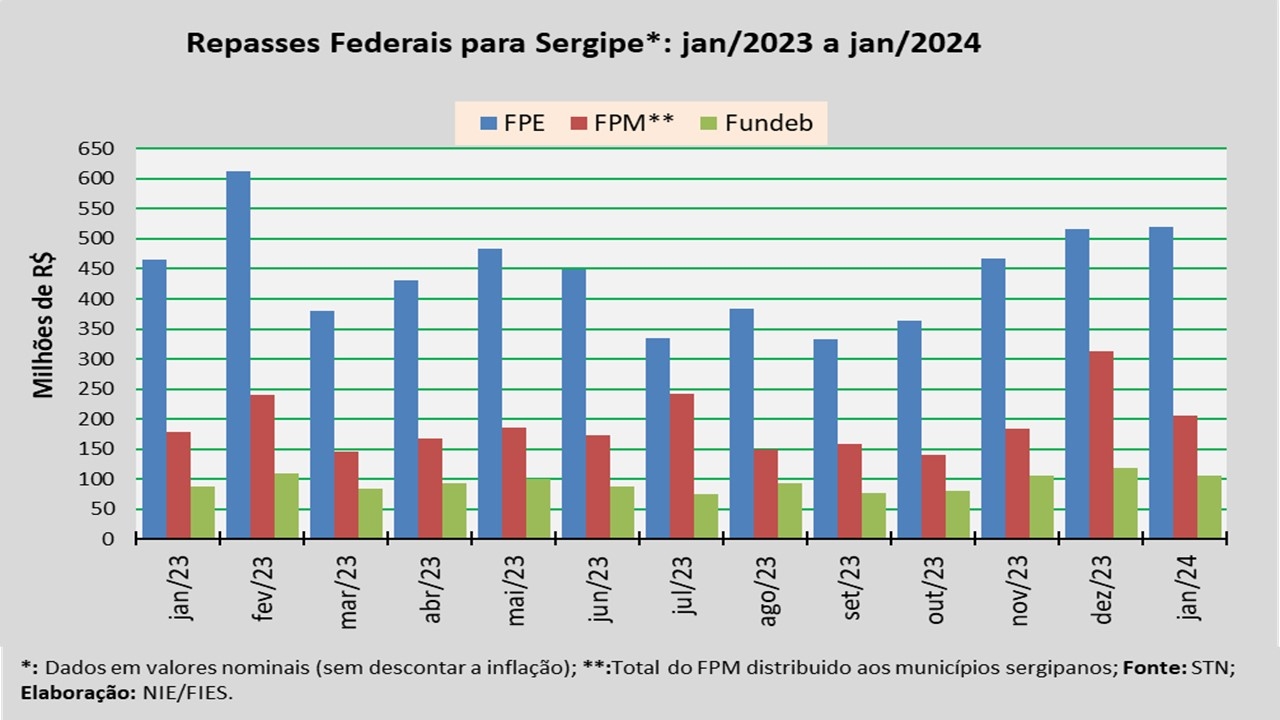 Análise realizada pelo Núcleo de Informações Econômicas da Federação das Indústrias do Estado de Sergipe (FIES), com base nos dados da Secretaria do Tesouro Nacional (STN), indicou que o repasse do Fundo de Participação dos Estados (FPE) para Sergipe, em janeiro do ano corrente, foi de R$ 520,7 milhões.