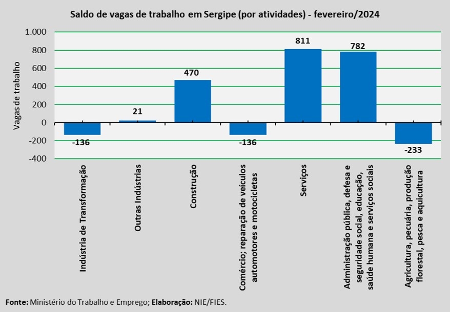 A análise dos dados apontou que houve abertura de vagas em quatro dos sete grupamentos de atividades econômicas do estado, com destaque para o grupamento de Serviços que registrou abertura de 811 novos postos de trabalho. Em seguida ficaram os grupamentos de Administração pública, defesa e seguridade social, educação, saúde humana e serviços sociais (+782 vagas); Construção (+470 vagas) e Outras Indústrias (+21 vagas).