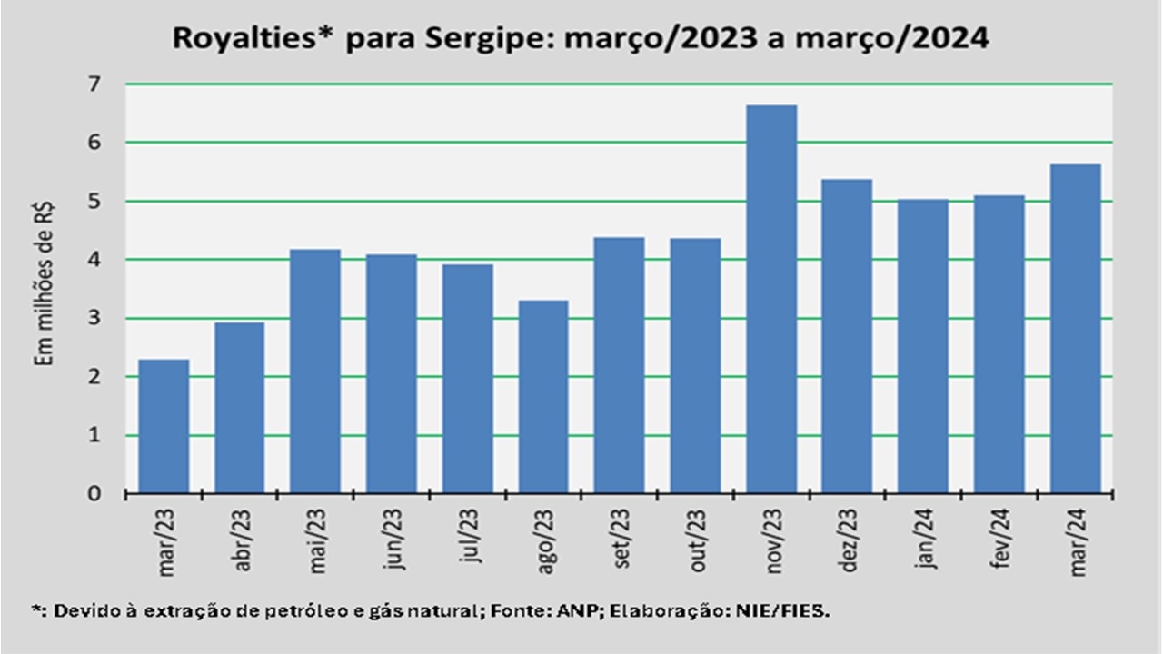 Os royalties creditados ao Estado de Sergipe de janeiro a março de 2024 acumularam cerca de R$ 15,8 milhões. O montante acumulado, até o momento, no ano foi 86,6% maior que o acumulado no mesmo período de 2023.
