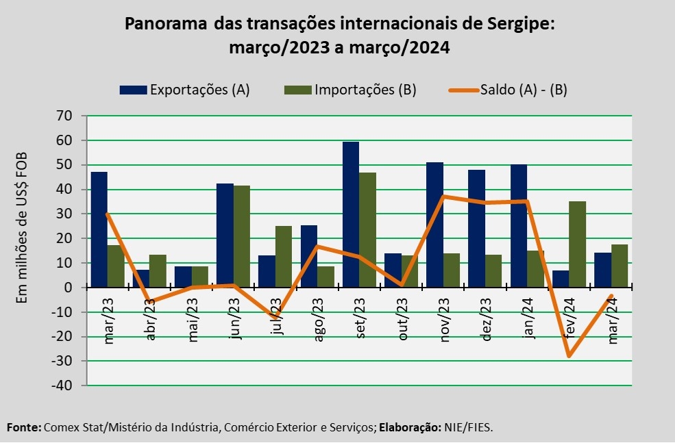 Análise realizada pelo Centro Internacional de Negócios – CIN/SE, da Federação das Indústrias do Estado de Sergipe (FIES), com base nos dados do Comex Stat, sistema para consultas e extração de dados do comércio exterior brasileiro, disponibilizado pelo Mistério da Indústria, Comércio Exterior e Serviços, apontou que as exportações sergipanas, em março de 2024, somaram US$ 14,2 milhões. O montante registrado representa aumento de 102,0%, quando comparado com o mês anterior, fevereiro último.