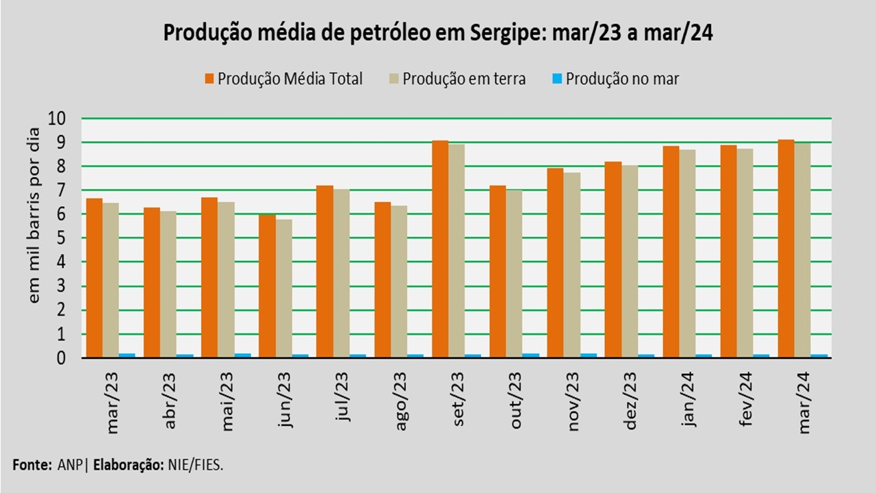 Já a produção no mar chegou, em média, a 141,5 barris por dia (bpd), abrangendo 1,6% da produção total. Em termos comparativos, verificou-se decréscimo de 9,6% em relação a fevereiro último. Na comparação com março de 2023, observou-se retração de 16,7%. ![]()