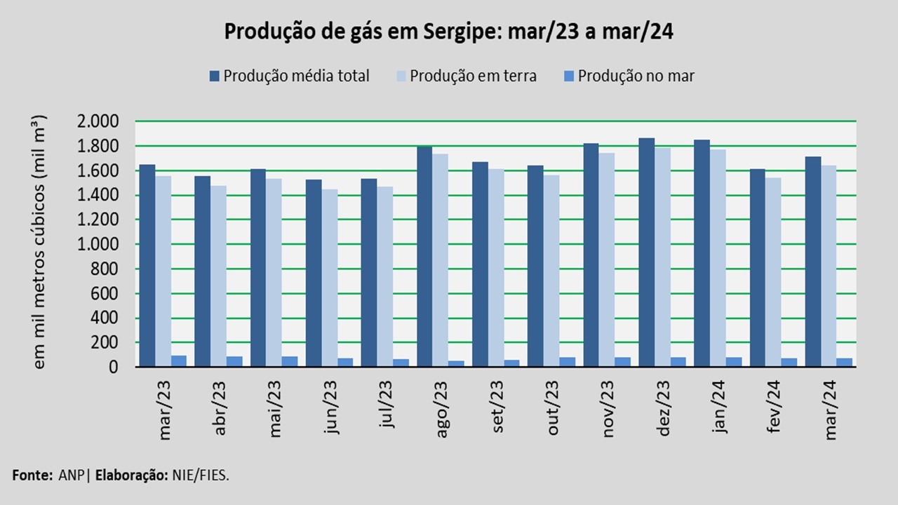 A produção em terra foi a principal fonte de produção de gás natural no estado, totalizando aproximadamente 1,64 milhão de metros cúbicos (m³), no período analisado. Esse volume correspondeu a 95,8% do total produzido no mês de março, ao passo que a produção em mar foi de 73 mil metros cúbicos (m³), representando 4,2% da produção.